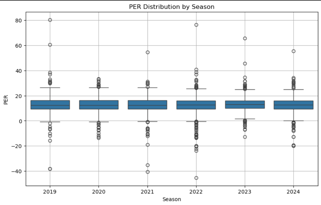 - Boxplot of Player Efficiency Rating (PER) by Season