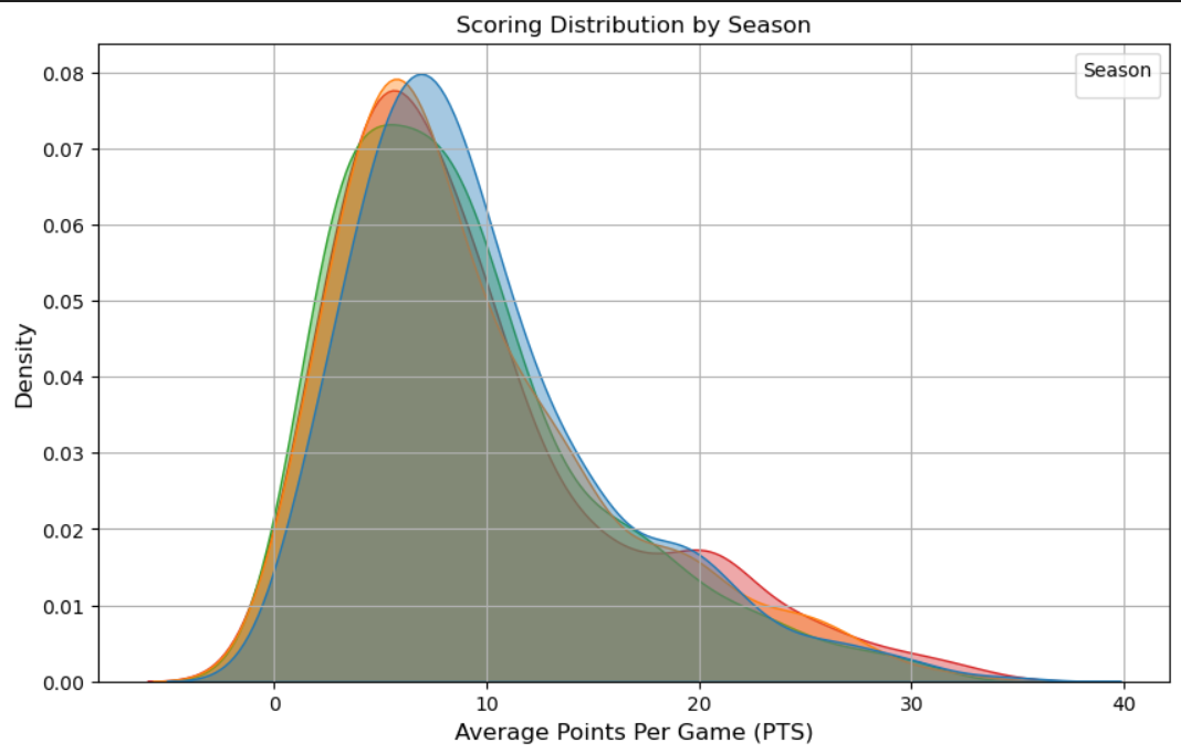 From 2019–20 through 2023–24, the PER distribution has grown wider, indicating greater disparity in individual efficiency. This means teams may exploit efficiency outliers—both recruiting high‑end performers and avoiding low‑efficiency contracts. - Density Plot of Points per Game (PTS) Over Time